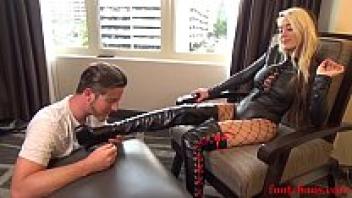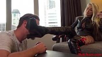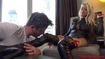 Worshipping Davina Dark while wearing leather boots - FootChaos.com