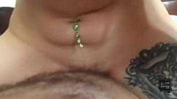 An inked teen and a nasty goth MILF share a big meaty cock.