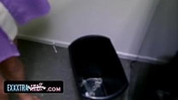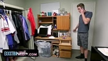 A small, petite brunette enters a football player's dorm room and is reprimanded by his enormous cock.