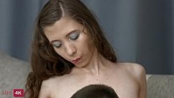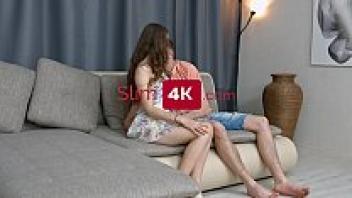 Anorexic, lanky, and long-legged Russian teenager lounging on a couch and enjoying hard anal