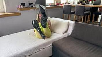 After roug sex, a horny girl wearing a fishnet gets a cumshot while wearing latex high heels.