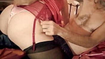 1362: French Blonde Amateur Wearing Red Dress Lingerie with Satin Underwear, Stockings, Garter Belt, and Heels