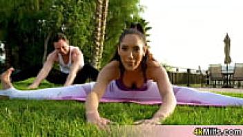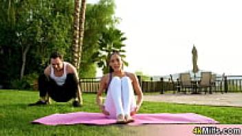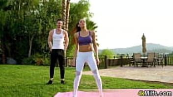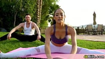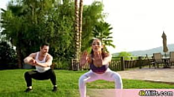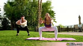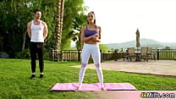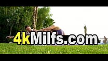 Brunette stepmother purchased a new bikini. It's blue, seductive, and seems quite little.