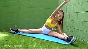 Yoga in the nude. Regina Noir. In the gym, a woman wearing white underwear does yoga. Complete Cam 1