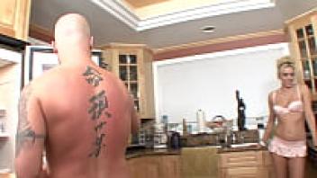 In the kitchen, the blonde stepdaughter receives affection.