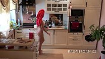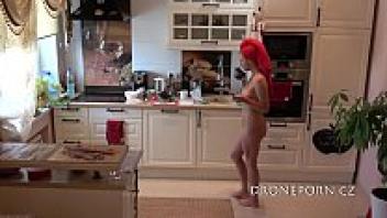 In the kitchen, cooking while nude