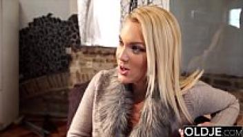 Intense orgasm and passionate kissing between an elderly guy and a young woman in the bedroom