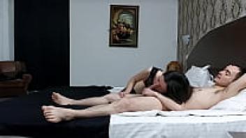 In the bedroom, an amateur teen couple engages in rough and difficult sex.