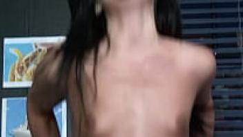 Creampie for a brunette milf with thin little tits