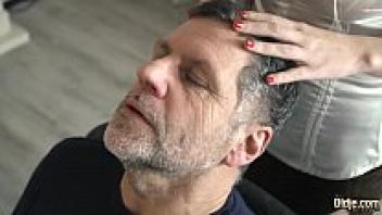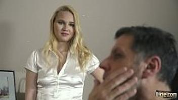 Teenage girl getting a face cumshot while on her knees sucking on her grandfather's cock