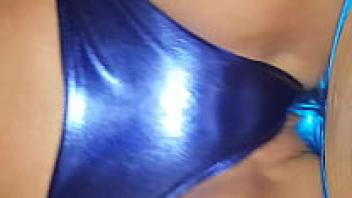 Loving in blue satin panties while on all fours