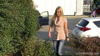 On a construction site, a sexy girl pisses in front of the workers and flashes her tits as she moves.