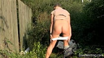 Outside, the obese mother-in-law pooped through her new underwear while spreading her legs wide.