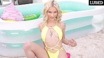 Emma Rosie, a petite beauty, fills her cunt with sperm and swims in oil.