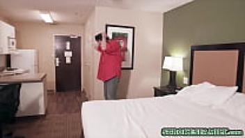 After being apprehended, the long-legged brunette thief will be punished by being loved from behind.