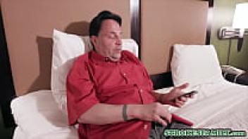 Close-up of a sloppy blowjob by a real amateur Latina teen on a big white cock
