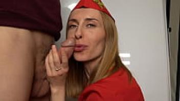 A red-uniformed, sexy stewardess sucking a large cock. Handjob and blowjob done by amateurs