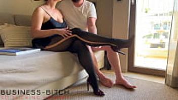 This stunning businesswoman, dressed in black satin, nylons, and heels, wore pantyhose in a doggystyle for sex.