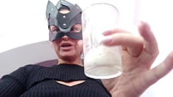 Mature wife gives me a blowjob, and I cum in her mouth. She smears sperm all over her large breasts. Homemade oral sex for an overweight couple. Amateur fetish.