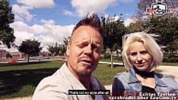 A slim blonde beauty wearing nylons and with tiny tits goes out for sex with a German visitor.