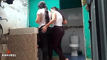 After getting hot in the bathroom, a couple of bigasses end up rubbing their pussies while standing up to the organization.