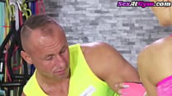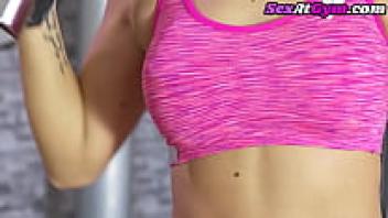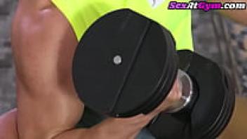 Following cunnilingus, a busty gym babe is seen riding trainers.