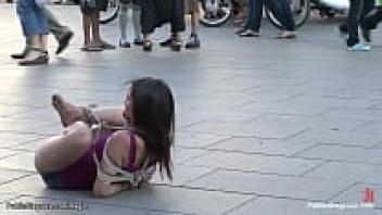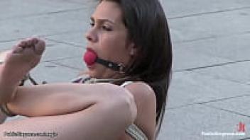 In public, a babe's throat was bound.
