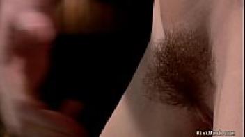 In bondage, a hairy pussy slave rides on top of a Sybian.