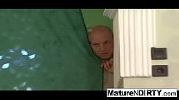 He is caught masturbating by a mature brunette.