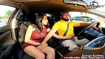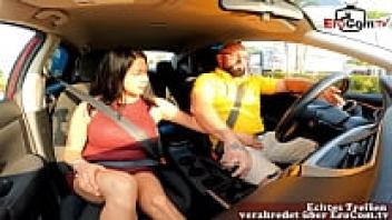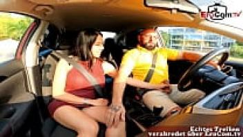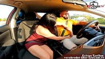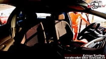 A car tows a tiny, German-blond street hooker for outdoor sex