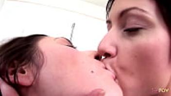 Big-titted, glamorous lesbians stop cooking to use sex toys to kiss and pound their shaved pussies.