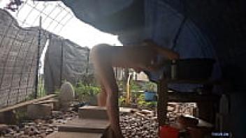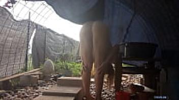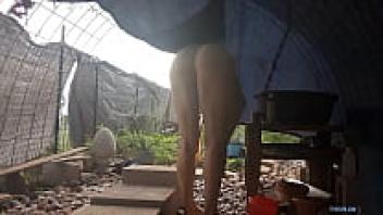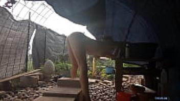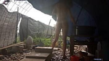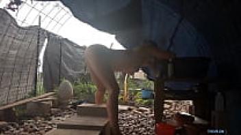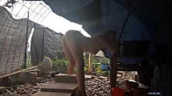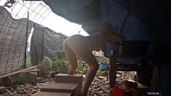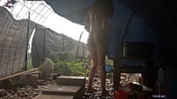 After a sweaty workout, a horny neighbour was caught snooping on a perfect assed milf taking a shower in her backyard.