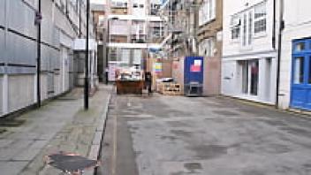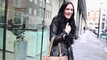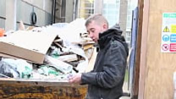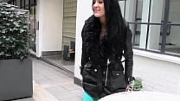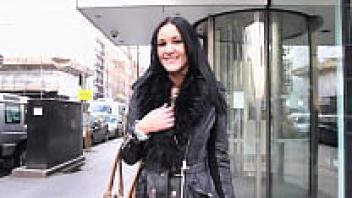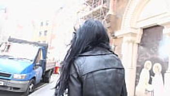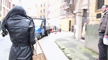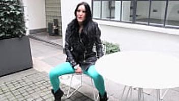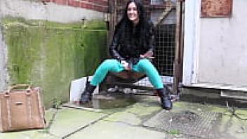 On a construction site, a sexy girl pisses in front of the workers and flashes her tits as she moves.