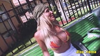 Playing with her pussy on a public hotel balcony, a blonde big-tit babe