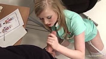 His firm cock is cared for by a beautiful nurse.