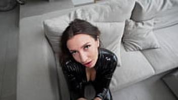 The latex-clad brunette removed the condom from her boss's enormous penis!