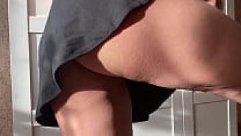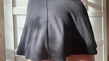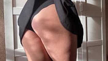 In a miniskirt, a seductive stepmother masturbates her creamy pussy.