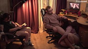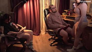 Glasses-wearing stepmother assists with a blowjob.