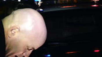 At a club, a large dicked guy is picking on a skinny, tattooed, blonde woman with short hair. She is getting a lot of attention.
