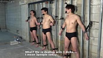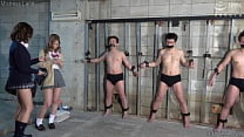 While wrestling, Japanese mistress Tomeki gives a naked masochistic man a handjob.