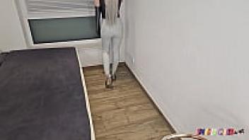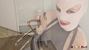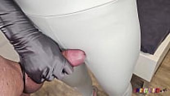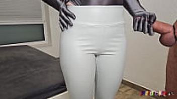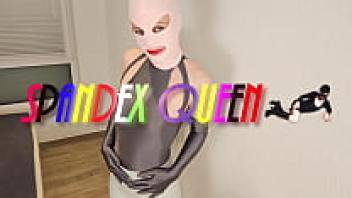 The spandexQueen makes two appearances and milks his cum on her gray spandex body while wearing white leather leggings.