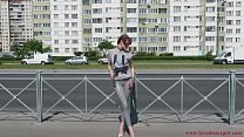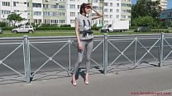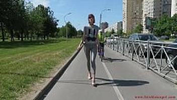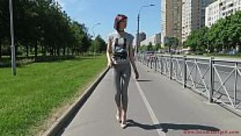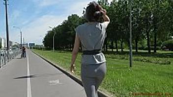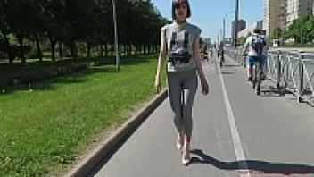Natalia, decked out in a pair of tight leggings, strolls down the street.