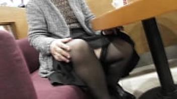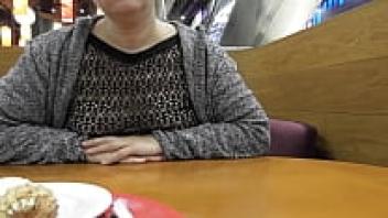 In a café, a hairy, mature display pussy