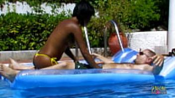 A ebony chick with big tits makes a white cock vanish in her shaved pussy.