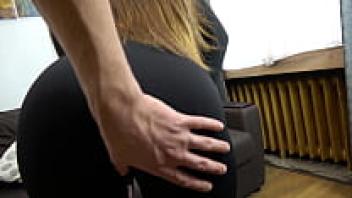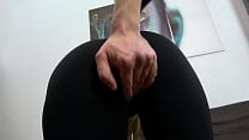 A brunette wearing black yoga leggings jerked off and cums on leggings after turning on a man with a massive cock.