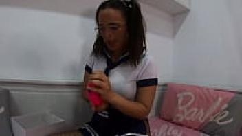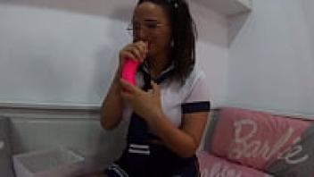 CLAUDIA BAVEL is a cosplay student girl with a dildo, ponytail, and glasses.