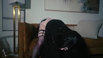 French babe dressed in a tight brown satin dress, a beige satin tanga, stockings and high heels, pussy licking, blowjob, rimming, and intense doggy style. 1767 (02)