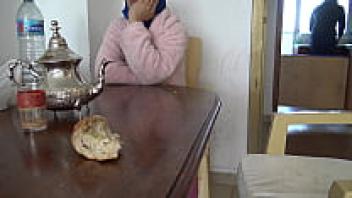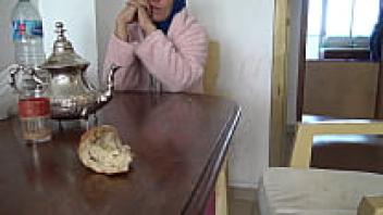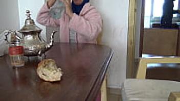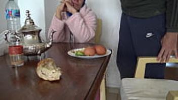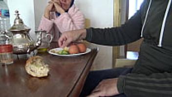 During breakfast, a gorgeous Algerian woman reveals her stepson her hairy pussy.