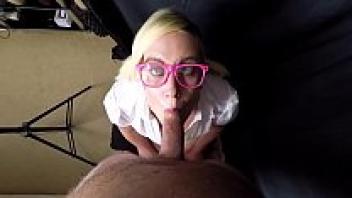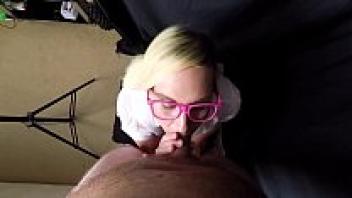Babe with Glasses Gets a Big Facial and Gives a Messy Blowjob