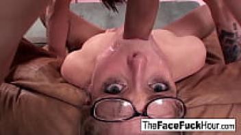 A gorgeous woman wearing spectacles puts his penis into her throat.
